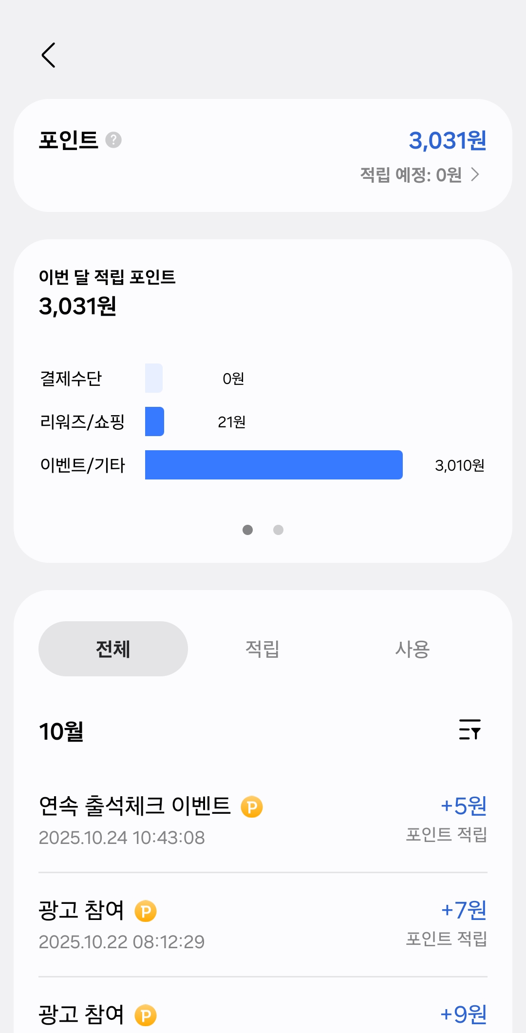 결국엔 쌀먹은 매일출첵 광고보면 포인트가쌓이는뎉 이게 5~10점 주니까 그냥 네이버페이가 더좋을지도...