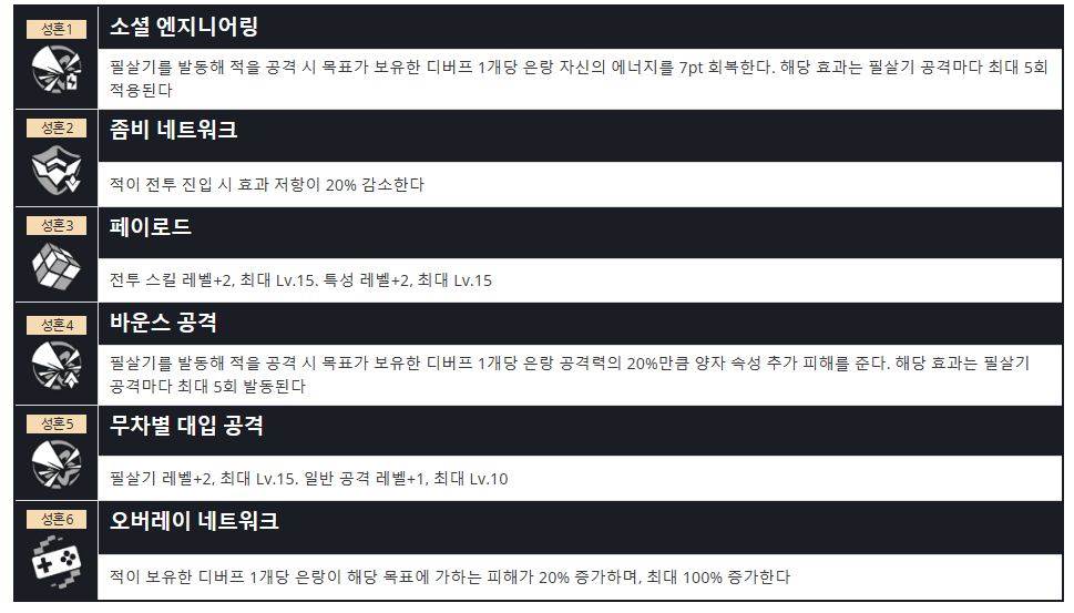 이 특성은 기본적으로 60%의 확률로 작동하며, 세 가지 다른 효과를 무작위로 추가합니다. 이 효과는 각각 3턴 동안 지속되며, 이로 인해 세 가지 효과가 동시에 적용될 확률은 상당히 낮습니다. 이 특성을 결정적인 요소로 만들려면, 이 특성을 최대 레벨로 업그레이드해야 합니다. 그러나 은랑은 이 특성을 활용하기 위해 명중률을 높여야 하며, 이는 캐릭터의 다른 능력에 영향을 미칠 수 있습니다. 따라서 이 특성은 은랑의 추가적인 장점으로 볼 수 있지만, 이를 주요 전략으로 사용하기 위해서는 주의가 필요합니다.